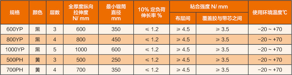 骨架材料选用低收缩、高卷曲度的合成聚酯纤维浸胶帆布,采用抗静电橡胶配方,是粮食及食品行业应用广泛的橡胶提升带。