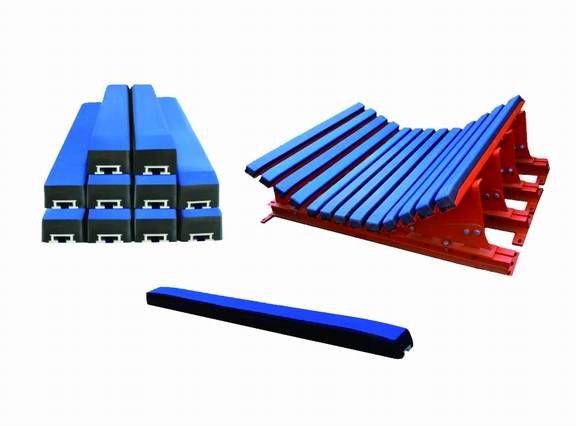 缓冲条是由橡胶、金属型材(钢件或铝型材)、超高板材经特殊方式处理,并通过热硫化的方式粘合的组合件。其主要用于大型皮带输送机进料口大落差的缓冲接料,高能吸收和低摩擦地缓解进料端落料的冲击力,为广大火电厂、建材、钢铁、港口及矿山等行业的皮带输送系统采用。